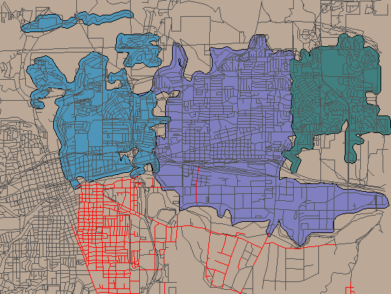 First, note that the blue area is not contiguous. Second, note that there are many regions of overlap between the blue and the purple areas and between the purple and green areas (we should have used transparent areas so that the regions of overlap were more clear). Third, note that at least one road segment highlighted in red (all having the same Zip code) occurs inside the purple zone where it is completely surrounded by all adjacent streets having a different Zip code.