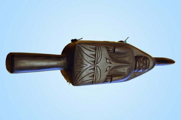 This ceremonial Raven Rattle is made of wood. The raven symbolizes creation and knowledge, and is known as the “Bringer of Light.” Throughout the Northwest Coast rattles are used in ceremonies. Shamans use rattles to cure the sick and to seek assistance from spirit helpers. They are used in music and usually accompany song, and their use implies the presence of supernatural power.