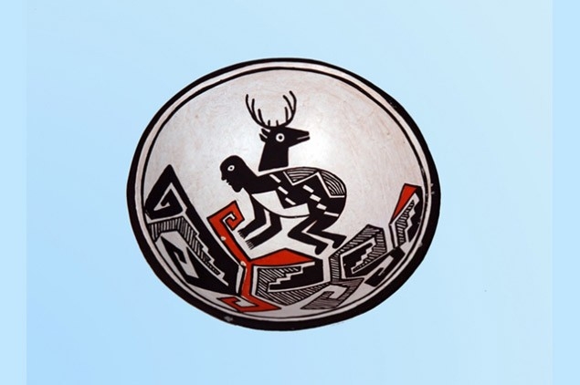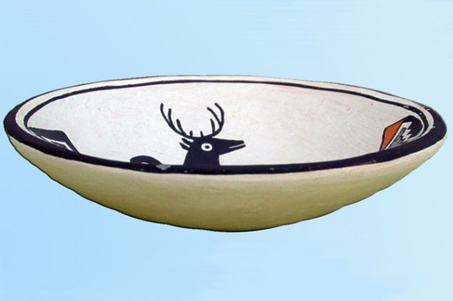 Black and red/orange paints are used to depict geometric designs and the figures of a man and a deer. The design and color is typical of the Acoma Polychrome style.