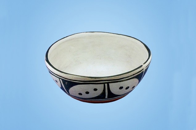 A bowl with a black geometric, possibly floral design around the outer edge.