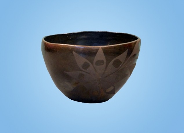 An unusual black on black bowl with squash blossom motif.
