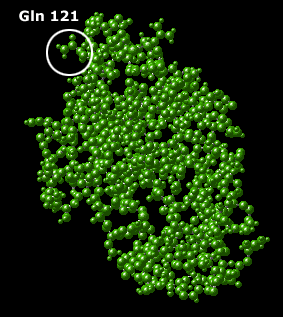 An antigenic determinant, a site on the antigen that the immune system responds to by making antibody, can frequently be one unique structure on the antigen. In hen egg white lysozyme, a glutamine at position 121 (Gln 121) protrudes away from the antigen surface. In this view, Gln 121 is circled. The antibody is not shown. The following images show how this feature is important for the formation of a high affinity antibody-antigen interactions. |