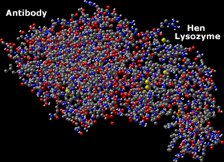 This image represents the structure of an antibody's variable region (Fab) complexed with an antigen, in this case hen egg white lysozyme. The other images in this section are derived from this structure.
