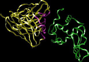 This ribbon structure shows the antibody's HV (purple) and FR (yellow) regions of the Fab, and their interaction with an epitope of the antigen.