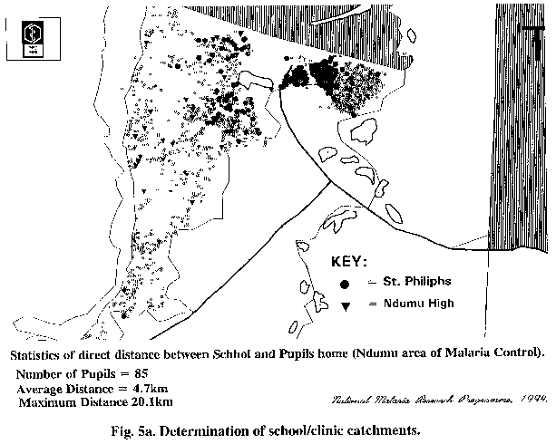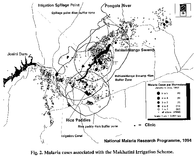 One example at the micro level centres on the issue of agricultural development in malarious areas. Between 1976 and 1986, the Mamfene area had an annual average of 12.6 cases of malaria. This increased to approximately 700 cases in 1987 as a result of excess water spillage due to agricultural irrigation. This spillage could have been avoided by proper planning in the development phase of the scheme, and highlights the need for intersectoral collaboration. The association between malaria cases and the scheme becomes evident when plotted on a map: mosquito flight ranges and breeding sites were affected or created by the irrigation process, and almost all malaria cases that occurred in 1987 fall within the buffers of these new ranges/sites (Fig. 2). The cases that occurred along the canal were probably associated with breeding sites formed as a result of the interruption of natural water runoff during construction, as well as leakage from cracks in the canal.