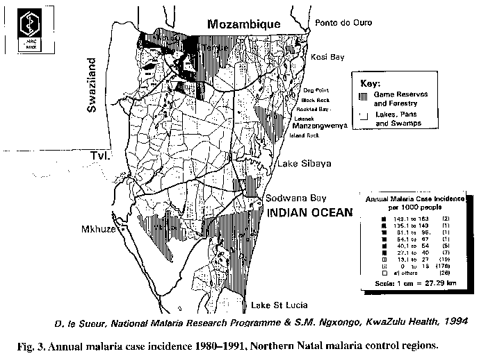The historical perspective of the disease is also important, as it helps to contextualize the successes achieved by the program to date. In 1932 every magisterial district within KwaZulu/Natal Province reported cases of malaria; estimated deaths over a 6-month period were in excess of 22,000 for a population at risk of 985,000 (le Sueur et al. 1993). The impact on the economy was enormous: construction of the Stanger Railway line ceased, and the sugar and tourist industries were crippled. Malaria is currently held at bay by extensive control efforts.