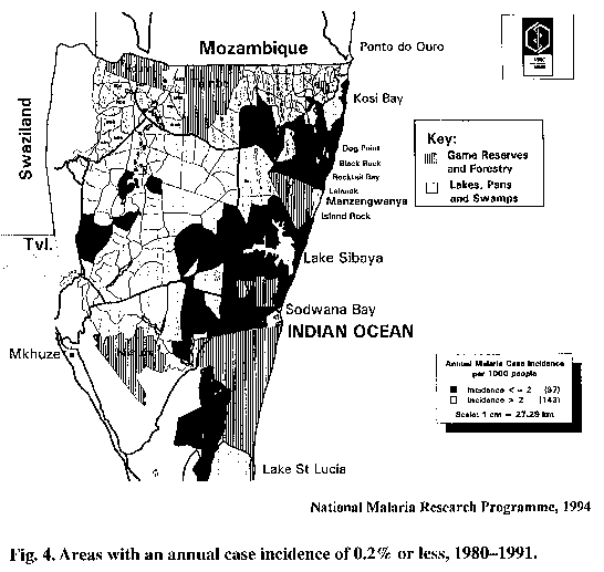 This argument is strengthened by extensive surveys that have been conducted in the region, in which almost no vector mosquito species were found. The plotting of the actively detected cases will strengthen this argument. In 1938 the same area constituted the only region of continuous transmission in the country. This change can be largely attributed to the eradication of Anopheles funestus from the region and the fact that this vector's breeding sites are not utilised by the remaining vector, Anopheles arabiensis. Control measures do not currently exist in Mozambique, thus a need exists to continue with residual spraying to prevent the reintroduction of the former species into South Africa. Nevertheless, it can be concluded from the available data that the risk of future disease within this region is negligible. The malaria control management implications of this are discussed later.