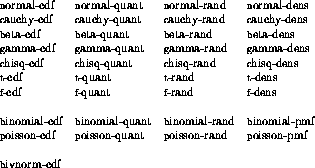 (uniform-rand 50)will generate a list of 50 independent uniform random variables. The functions normal-rand and cauchy-rand work similarly. Other generating functions require additional arguments to specify distribution parameters. Here is a list of the functions available for dealing with probability distributions: