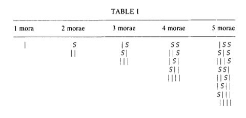 For [a meter of] five [morae], variations of two earlier [meters] of three morae [and] of four morae, being mixed, eight is obtained.