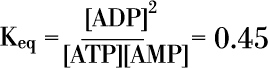 For example, a key enzyme in cells is adenylate kinase, which catalyzes the transfer of a phosphate group (PO4-) from adenosine triphosphate (ATP) to adenosine monophosphate (AMP). The result of this reaction is the formation of two molecules of adenosine diphosphate (ADP) by the following reaction, ATP + AMP ↔ 2 ADP. The equilibrium constant (Keq ) for this reaction is calculated as shown below: