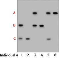 The possible genotypes are AA, BB, CC, AB, BC, and AC as shown in the diagram below. Each of these genotypes can be distinguished as a different 1- or 2-band pattern after Southern hybridization, as shown in the autoradiogram to the right.