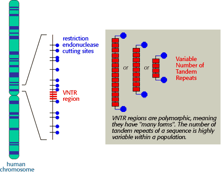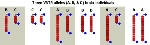 The most common forensic method to characterize VNTRs is using Southern hybridization as described for Problem 1. If the DNA flanking a VNTR is cut with a restriction endonuclease, the size of the resulting DNA fragment can vary, resulting in RFLPs, or "restriction fragment length polymorphisms." This is shown diagrammatically in the figure, where the red boxes represent the repeat unit and the blue lollipops represent cut sites for a restriction endonuclease. In this diagram, only three different variants (alleles) are illustrated for the VNTR locus, but 50 or more different alleles are often found at human VNTR loci.