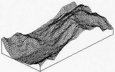 Raster data can be thought of as a matrix, a spread sheet, or data on a regular grid. An image, for example, would be raster data; so would an interpolation surface created from a file of scattered data, such as the one below: