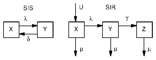 First we look at some simple models in which we assume a homogeneous population and random contacts. Remarkably, these illustrate some of the basic ideas of the epidemiology of infectious diseases. Figure 4 shows connectivity diagrams for two types of diseases.