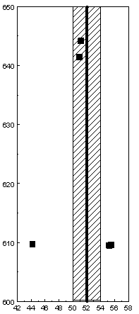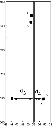 Figure 3-10 (left). Map of line in the feature file Ch3_line.bna (solid vertical line), and its buffer (cross-hatched region). Points 1 and 2 are in the buffer zone and are adjacent. Note that the "line" should really be segment: the line drawn has been extended beyond the segment's actual extent: it should run from a y value of 609 to 645.