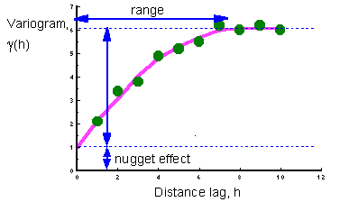 The nugget plays an important role in this characteristic: if one chooses a variogram model without a nugget, then the interpolation will be smooth: that is, for points in the neighborhood of a data point, the values of the estimate will tend toward the data variable value as we tend toward the data location. With a non-zero nugget, however, this is no longer true: kriging still yields an interpolator, but it is a "jump interpolator" - smooth all around the data values, but making jumps up to data to satisfy its role as an interpolator of the data.