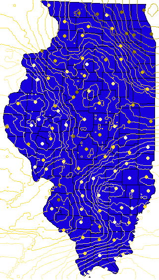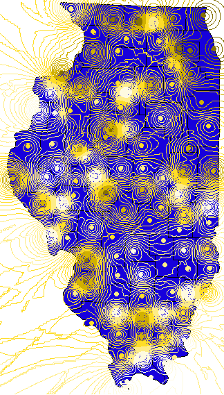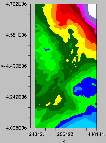 Can you guess which is which? They are obviously not the same! The ArcView map (on the left), created using Inverse Distance Weighting, has much more "confidence" in the data than does the kriging map. See how the IDW map swoops up to meet the data points: the kriged map won't do that, because of the nugget in the model.
