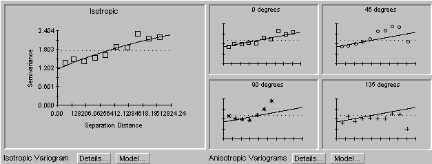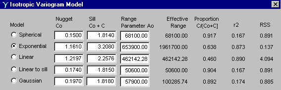 Note that the software gives us four directional variograms too, so that we can decide if an isotropic model is a good idea. In this case, it doesn't look too bad. Note also the sample mean, which is shown with the straight dashed line in the plots. The model that was plotted (and additional possible models) are shown in another screen: