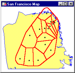 Example Vertical Mapper was used to create a Natural Neigborhood (Voroni) diagram for McDonald's Restaurants (marked with stars) in San Francisco. The edges of each area (also known as a Thiessen polygon) are equidistant between adjacent outlets. This technique can be used to select locations that maximize distance from sister stores or competing ones. Thiessen polygons create a sense of a chain's location strategy and provide a tool to visualise the effect of potential changes in strategy. |
