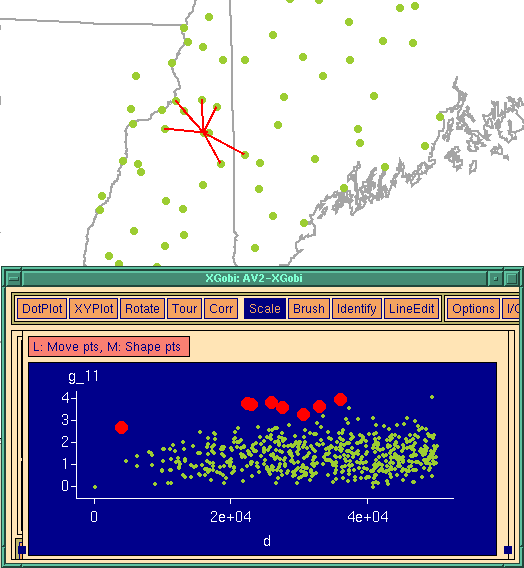 Figure 1 shows a variogram-cloud plot for precipitation sampling stations in which several potentially outlying points have been brushed. Because each point in the XGobi window corresponds to a pair of sampling locations, when the points in XGobi are brushed the Arcview window shows each pair of sampling locations connected by a line. This is also shown in Figure 1. Notice that all of the outlying points have a single sampling location in common. When the Arcview window is displayed with elevation contours, it is immediately obvious that the location in question is located on top of a mountain, which accounts for the large difference in precipitation.